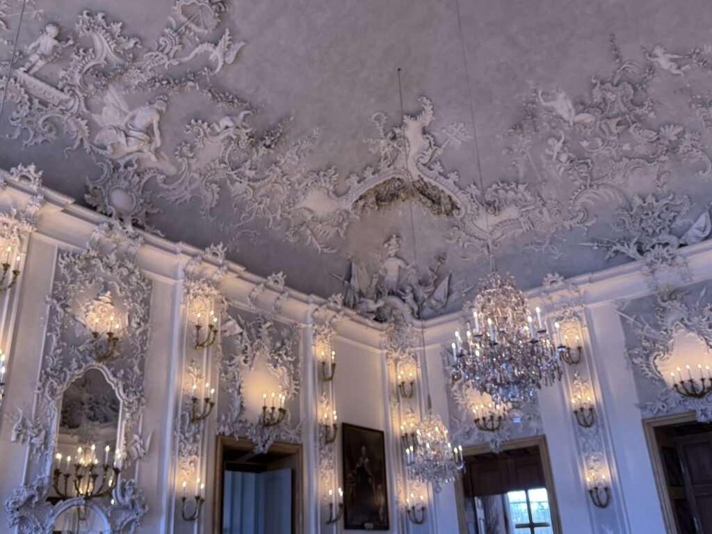 The decorations are all in stucco, that is plaster, but plaster raised to a high art. The corners are all in martial themes. Leaving your guards (probably standing at parade rest) you enter the next room to be received by the Prince-Bishop.